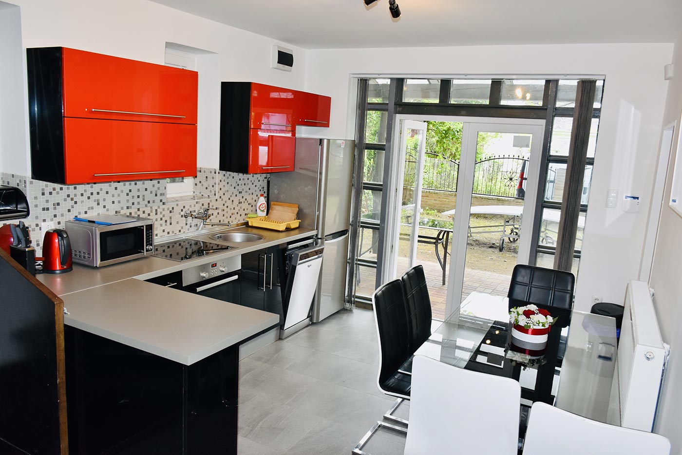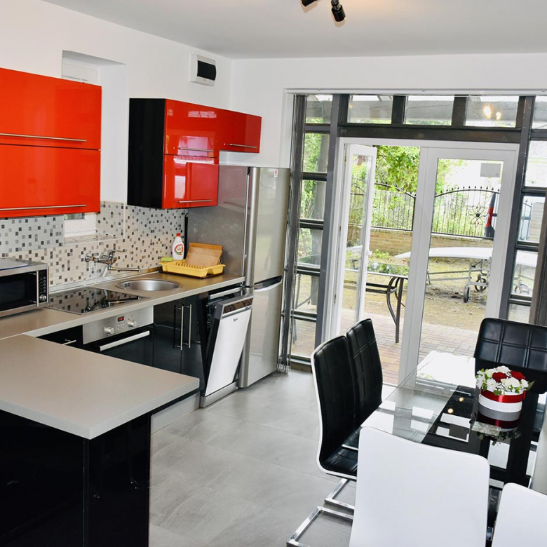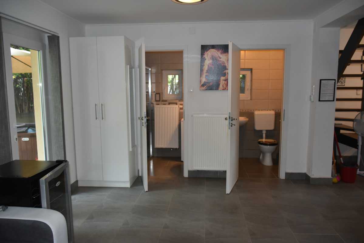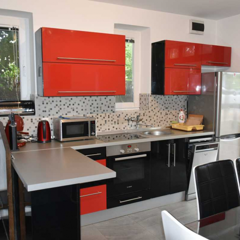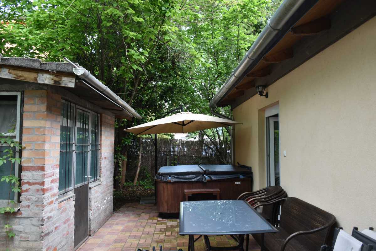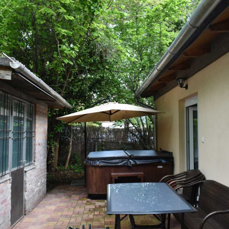 Felszereltség: jakuzzi, két klíma, központi fűtés, faszenes grill, sütő, mosogatógép, szúnyoghálók és árnyékolók. A zárt, fákkal és bokrokkal beültetett udvar teljesen privát használatú. A házhoz első és hátsó terasz is tartozik, elektromos kapuval.